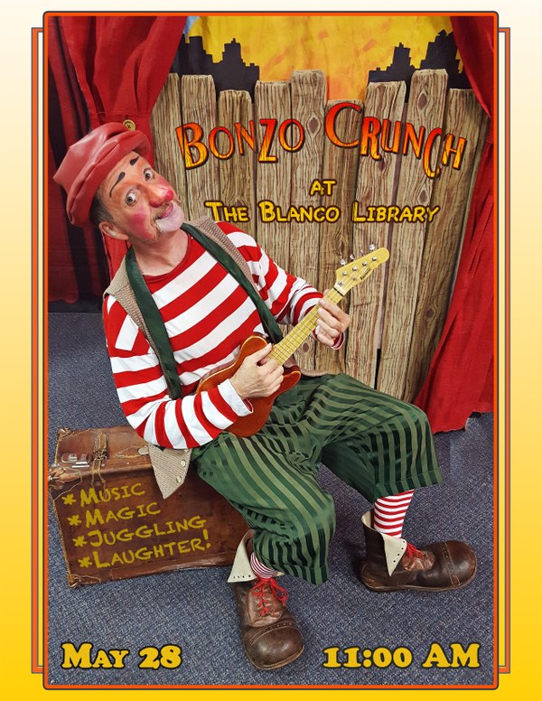 On Wednesday, May 28 at 11:00 AM, Bonzo Crunch, "Fool at Large," returns to the Blanco Library to help us kick off our Summer Reading Program with some guaranteed clowning around! All ages are welcome! Admission is free! And we're not joking, well, maybe a little! See you then!